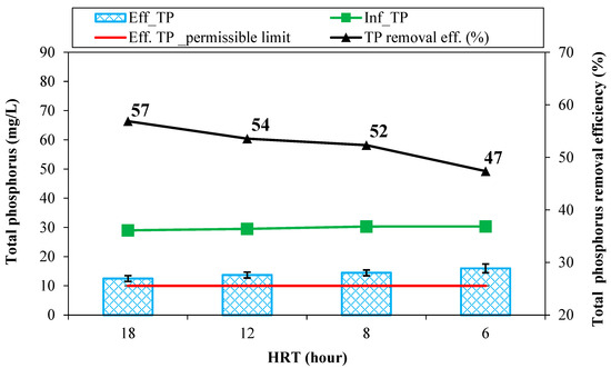 Total phosphorus removal at various HRTs and effluent TP discharge permissible limit.
