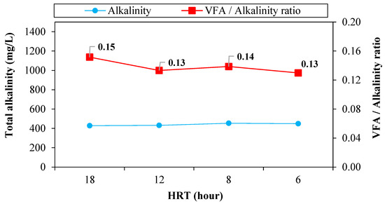 The resilience of the anaerobic process to pH fluctuations is determined by the reactor alkalinity [47]. Total alkalinity (TA) of the reactor and VFA/TA ratios are presented in Figure 8. Reactor TA varied between 465 and 410 (mg/L as CaCO3). At HRTs of 18, 12, 8, and 6 h average TA concentrations were 428, 432, 454, and 449 (mg/L as CaCO3), respectively. The stability of the anaerobic process is determined by the VFA/TA ratio, and it should be less than 0.25 to ensure proper operation of any anaerobic process [48]. SABR VFA/TA ratio varied between 0.16 and 0.11 with average values of 0.15, 0.13, 0.14, and 0.13 at HRTs of 18, 12, 8, and 6 h, respectively, which indicated that the SABR performed well during the performance evaluation phase. A VFA/TA ratio greater than 0.3 represents poor stability of the anaerobic process, necessitating corrective measures [49].