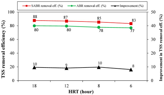 Similarly, the performance of the reactor in terms of TSS removal before and after the incorporation of polyurethane sheets is presented in Figure 10. Under steady-state conditions, the TSS removal efficiency of the reactor ranged from 80% to 77% when the HRT was reduced from 18 to 6 h prior to the installation of polyurethane sponge sheets. Following the introduction of these sheets, the TSS removal efficiency improved, varying from 88% to 83% as the HRT was reduced from 18 to 6 h. The corresponding improvement in TSS removal efficiency due to the introduction of sponge sheets was 10%, 9%, 10%, and 8% at HRTs of 18, 12, 8, and 6 h, respectively. The preceding discussion revealed the significance of incorporating polyurethane sponge sheets into the ABR under investigation which improved its treatment performance. This improvement might be attributed to the surface area offered by the sponge sheets, facilitating both biomass retention and growth, along with effective adsorption of suspended solids.