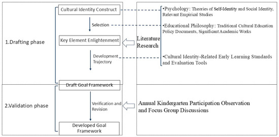 The development of the goal framework for cultural identity enlightenment was grounded in the theory of curriculum theorist Ralph Tyler [25] and proceeded through two phases (see Figure 1). Initially, the drafting phase primarily employed literature research, while the validation phase relied on field observations and focused group discussions with the research team.