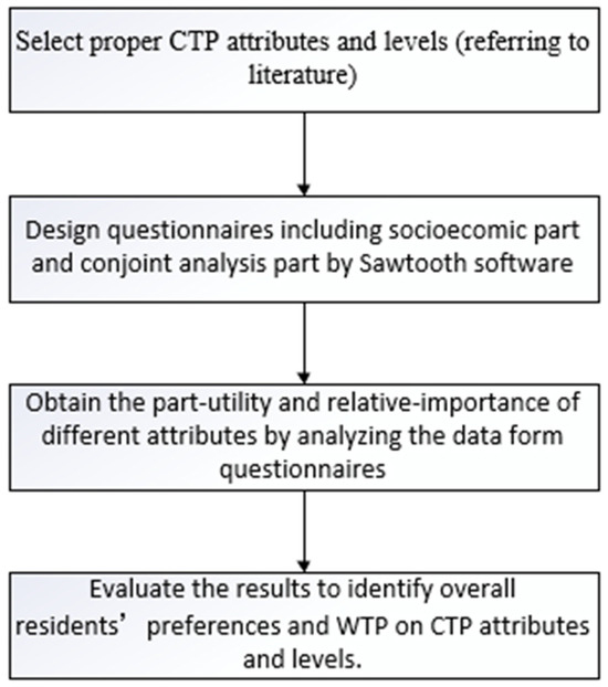 Since the 1970s, conjoint analysis (CA) has been widely used in the field of evaluation of consumers’ multi-attribute utility functions [30,31]. The effectiveness of CA for the assessment of individual preferences has made it a common method for market research and scientific studies [32,33]. CA mimics the trade-off process of real consumers by examining the joint effects of combinations of attributes on respondents. Beggs’ work was the first application of conjoint analysis in the environmental domain [34]. Moreover, it has proven effective in assessing non-market values [35]. CA has also been promoted for identifying consumers’ willingness to pay for environmental issues [32]. It is inferred that CA can be used to examine the attitudes of residents toward different carbon tax policy attributes.