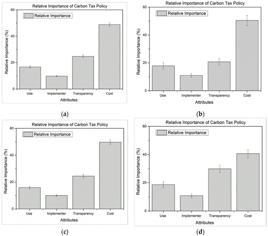 Figure 2b–d show the relative importance of different CTP attributes for residents with different levels of understanding of the CTP. From Figure 2b–d, residents’ understanding level of the CTP improved from “None” to “Clear”. The results reveal that “use of carbon tax revenue” and “carbon tax policy implementers” have similar relative importance rates of approximately 18% and 10%, respectively, among residents with different perceptions of the CTP. In contrast to the performance of these two CTP attributes, the relative importance of the other attributes changed as residents’ knowledge of the CTP increased. The relative importance of “cost of CTP” (50.45%) was much greater for the group with no knowledge of the CTP than for the other two groups with knowledge of the CTP. As the understanding level of the CTP improved from “some” to “clear”, the relative importance of cost of the CTP decreased from 49.75% to 40.65%. In complete contrast to this trend, the relative importance of “transparency of carbon tax policy implementation process” rises as the level of understanding of the CTP increase. For the level from “None” to “Clear”, the relative importance is ordered as 20.7%, 24.41%, and 29.85%, respectively. This result clearly shows that as people’s understanding of carbon tax policies increases, their sensitivity to the cost of carbon taxes decreases and their demand for transparency in the implementation of carbon tax policies increases.