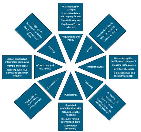 - Reynolds, C.; Goucher, L.; Quested, T.; Bromley, S.; Gillick, S.; Wells, V.K.; Evans, D.; Koh, L.; Kanyama, A.C.; Katzeff, C.; et al. Review: Consumption-stage food waste reduction interventions—What works and how to design better interventions. Food Policy 2019, 83, 7–27. [Google Scholar] [CrossRef]