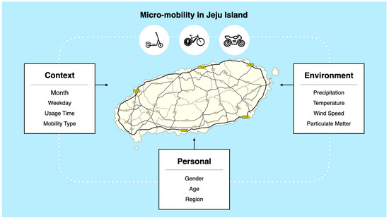 Additionally, environmental factors significantly influence the usage of micro-mobility services. Research shows that adverse weather conditions, such as cold temperatures, rain, and high humidity levels, reduce both the likelihood of using bike-share systems and the duration of trips [43]. Furthermore, high temperatures above 30 °C were found to decrease bicycle usage, highlighting the importance of considering not only severe cold but also heat waves when predicting demand [44]. Similarly, rainfall has a notable impact on micro-mobility, with higher rainfall levels correlating with shorter trips [45]. In addition to weather-related factors, air quality plays a critical role: particulate matter levels were shown to have statistically significant negative impacts on bike-share usage throughout the year [46]. Moreover, the perceived risk associated with high particulate matter levels negatively affects user trust in tourism destinations, further reducing the demand for micro-mobility services [47]. These findings underscore the necessity of incorporating various environmental variables into models predicting micro-mobility usage patterns, especially in regions like Jeju, where climatic conditions vary seasonally.