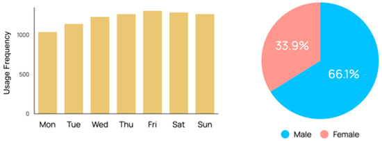 Micro-mobility usage by weekday and gender. The left side represents the frequency of micro-mobility usage by day of the week, while the right side shows the percentage distribution of micro-mobility usage by gender.
