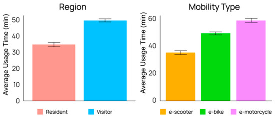 T-tests and ANOVA were conducted to examine whether there were differences in micro-mobility usage time based on gender, region, and mobility type. In the analysis of micro-mobility usage time based on gender, the assumption of equal variances was satisfied, allowing for the execution of a t-test. The t-test results indicated no significant differences in micro-mobility usage time between genders, affirming that both male and female users engaged with micro-mobility services (p = 0.11). Upon examining the differences in micro-mobility usage time based on region, it was found that the assumption of equal variances was not met, leading to the implementation of Welch’s t-test. As shown in Figure 3, the results indicated significant differences by region, with t(1558.801) = −9.51, p < 0.001, d = 59.86, demonstrating that visitors (M = 49.59, SD = 61.55) had longer usage times compared to residents (M = 34.39, SD = 45.49). Subsequently, an analysis of micro-mobility type differences using ANOVA also revealed violated equal variance assumptions, necessitating Welch’s ANOVA. The differences were significant, F(2, 4401.97) = 71.67, p < 0.001, with post hoc analysis using Dunnett’s T3 showing a descending order of usage time from e-motorcycles (M = 57.29, SD = 64.22) to e-bikes (M = 48.11, SD = 60.36) to e-scooters (M = 35.96, SD = 51.79).