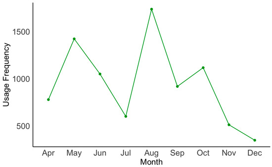 Descriptive statistics revealed discernible patterns in micro-mobility usage. Frequency analyses, depicted in Table 2, showed that Monday and Tuesday were the lowest usage days, with usage increasing closer to the weekend (Figure 2). Seasonal variations were noticeable, with August and May showing the highest usage and a notable decrease observed in November and December, corresponding with the colder temperatures. The preferred type of micro-mobility was the e-bike, which surpassed the e-motorcycle and e-scooter in usage frequency. There were 3889 instances of usage by men and 1995 by women in terms of gender. In terms of age demographics, teenagers accounted for 1016 cases, individuals in their 20 s for 1878 cases, followed by those in their 30 s with 1292 cases, 1061 in their 40 s, and 611 in over 50 s. There were 1011 uses by residents of Jeju Island and 7480 instances of use by visitors.