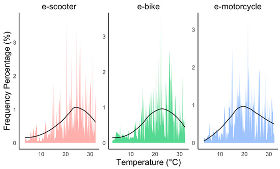 Environmental conditions, specifically temperature and precipitation, were also found to impact micro-mobility preferences, with lower temperatures and the absence of rain increasing the likelihood of e-bike selection over e-scooters. Interestingly, as seen in Figure 5, the frequency of choice varied for each type of mobility depending on the temperature. While e-scooters and e-bikes showed similar trends, e-motorcycles tended to be chosen more frequently, even at relatively lower temperatures, despite the speed limits being the same for all. This raises the need for further research into the relationship between each type of micro-mobility and temperature, as psychological or physical factors of users, which were not covered in this study, may be involved.