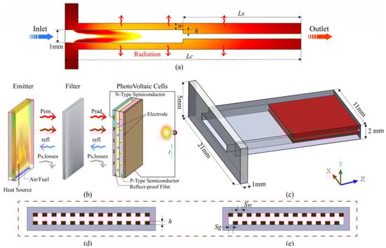 (a) Side view of burner, (b) diagram of a typical micro-TPV system, and the combustor with (c) exit step, (d) symmetrical gaps, and (e) stagger gaps [14].