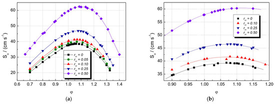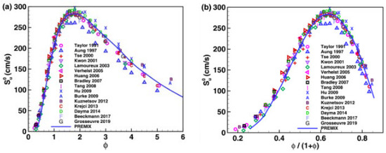 Laminar burning velocity (vertical axes) of H2/air at NTP as an expression of the equivalence ratio (horizontal axes) (a). Standard equivalence ratio (b). The symbols represent empirical findings from multiple investigations [22].