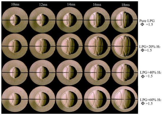 Miao et al. [25] discovered experimentally that the addition of hydrogen significantly increases the LPG’s laminar burning velocity, with a more significant acceleration when the hydrogen content rises above 60%. At different equivalency ratios, the impact of the hydrogen addition on diffusion thermal instability as indicated by the Markstein length was examined. The addition of hydrogen results in a decrease in flame thickness; hydrogen has a less significant effect on flame thickness than the equivalency ratio. The flame thickness values for a fuel mixture of 10% LPG and 90% hydrogen are consistent for all the equivalency ratios, as shown in Figure 5. Sun et al. [26] examined laminar spherical flames propagating within a homogeneous hydrogen–air mixture, focusing on the effects of initial conditions such as the equivalence ratio, initial pressure, and initial temperature on the propagation characteristics. During propagation, the global stretch rate decreases steadily towards convergence. It initially increases and then decreases as the equivalence ratio (Φ) rises from 0.5 to 4.0, with the maximum value occurring at Φ = 1.8. The propagation speed constantly climbs within stoichiometric and rich mixtures, but dips and then rises within lean mixtures when the global stretch rate decreases. The initial temperature does not affect the Markstein length, but the equivalency ratio and initial pressure do. While the variation of the starting thermodynamic circumstances changes the unstretched LBV consistently, the variation of the equivalency ratio does not change it equally. The flame gets increasingly unstable as a result of the reduced stretch effects. Hydrodynamic and thermal-diffusive processes are used to look at the connection between the starting conditions and the critical flame radius of cellular behavior. Furthermore, the critical Peclet number is found to be linearly related to the equivalence ratio, but it is less sensitive to the initial ambient conditions.
