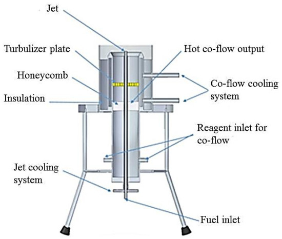 Cardona et al. [29] scrutinized the combustion characteristics of a syngas blend, comprising hydrogen, carbon monoxide, and carbon dioxide, in the absence of a visible flame by utilizing heated and diluted streams. The studies were carried out utilizing a jet in a hot co-flow burner, which consists of a core fuel jet surrounded by a stream of combustion products, as depicted in Figure 6. The jet nozzle was used to release the syngas mixture, resulting in the attainment of a high temperature and low oxygen concentration in the jet flame [30,31,32]. Three distinct oxygen compositions of 2.0%, 4.7%, and 6.9% were examined in the oxidant stream. Measurements of the temperature and species concentration were taken along the axial and radial lines at a constant Reynolds’s number. The results indicate that elevating the oxygen content leads to a decrease in the CO and NO emissions throughout the entire process. Mihaescu et al. [33] focused on the key factors involved in designing a hydrogen burner. Using Ansys-Fluent software 14.0, numerical modelling was employed to establish the relationship between the flow velocity of the combustible gas jets, the required air, and the combustion rates. Combustion models, both analytical and numerical, were used to determine the optimal ratios between the combustion and flow velocities, as well as how they compared to those used for methane combustion. These findings were then correlated with the established guidelines and recommendations for burner designs.