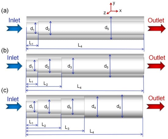 Geometries of the micro combustors (a) combustor with 1 step, (b) combustor with 2 steps, and (c) combustor with 3 steps [39].