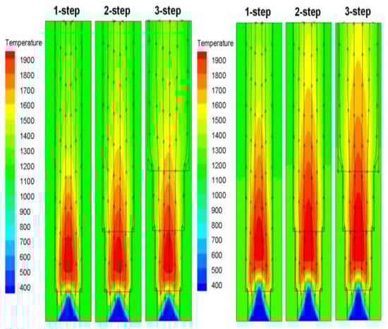 Wei et al. [38] investigated the use of a block and no block in a micro heat-recirculation combustor for the combustion of premixed H2/air. Additionally, the impact of the flow rate, heat recirculation, and block configuration on the combustion parameters and thermal performance were investigated. The block reduced heat loss through exhaust gas and increased flame stability and preheating, according to the data. But it also reduced the residence period of the reactants. A transverse block setting provided better thermal performance than a longitudinal one, with an increase in block height resulting in a broader high-temperature zone and improved radiation. On the other hand, a 10 mm tall block reduced the heat recirculation’s effects and lowered the temperature of the outside wall. Proper placement of the block and block height can greatly enhance radiant efficiency, heat transfer, and micro power generator optimization. In Tan et al. [39], a three-dimensional mathematical model was built to achieve a homogeneous and elevated wall temperature distribution in micro combustors with rearward-step structures, using premixed hydrogen–air mixtures. It looked at how the inlet velocity and rearward-step architecture affected the micro combustor’s thermal performance and combustion characteristics. The micro combustor’s flame stabilization and combustion intensity were both enhanced by the rearward-step structure, according to the results. As demonstrated in Figure 8 and Figure 9, an increase in rearward-steps from one to three produced an improvement in the lower and higher flammability limits of 20% and 3.5%, respectively, and a maximum combustion efficiency difference of roughly 2.28% at an input velocity of 7.0 m/s. Nevertheless, in the micro combustor, the rearward-step construction raised the mean outside wall temperature and worsened the outer wall temperature uniformity. The combustor with three stages had a mean outer wall temperature and temperature differential that were 6.3 K and 39.6 K higher, respectively, than the combustor with one step at an intake velocity of 5.0 m/s. In the micro combustor with three phases, the maximum synergy degree was 2.99% with an equivalency ratio of 1.5 and an inlet velocity of 7.0 m/s.