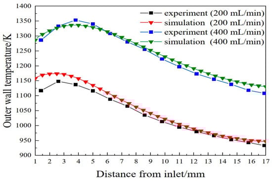 Peng et al. [40], using both experimental and numerical methods, examined the thermal performance and combustion properties of premixed hydrogen/propane/air in a micro planar combustor with a block insert. The impacts of the block width, flow velocity, equivalency ratio, and hydrogen blended fraction on heat transfer and flame stability were examined in the results. The findings showed that adding hydrogen to the micro combustor increased its combustion stability, with the lowest hydrogen blending mole percentage discovered via research using experiments, as depicted in Figure 10. A high fuel rate block (0.7 mm) put into the combustor produced the largest range of combustion stability. Additionally, the block size and hydrogen blending ratio had a substantial impact on the wall temperature; a greater radiation temperature was obtained with an acceptable block width and H2/C3H8 mixed burning temperature. The effects of the hydrogen fraction on reaction pathways were also examined in the study. The rates of OH and H production were determined by evaluating the reactions of H + O2 = OH + O and H2 = OH + H, which revealed significant effects on the reaction area and flame location. It was discovered that, for the same chemical energy input of Ec = 90.6 W, the combustor, designated as C0.7, which was fueled with 90% hydrogen, attained the maximum average wall temperature of 1150.3 K and a radiation power output of 27.9 W.