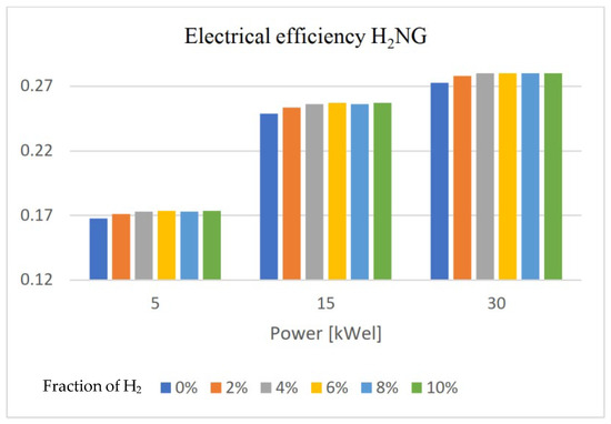 Divergence of electrical efficiency with H2% at 5, 15, and 30 kWel [43].