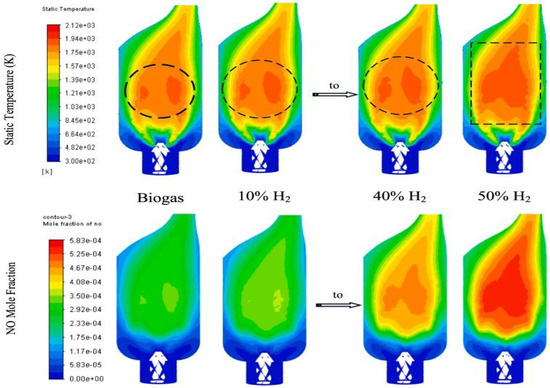 A sequence of images describing the biogas flame temperature distributions [K] (above) and NO emissions (below), with different rates of hydrogen concentration by Vol% [56].