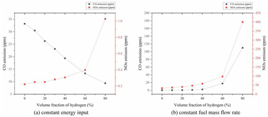 Emission characteristics for hydrogen–methane fuels: (a) constant energy input, and (b) constant fuel mass flow rate [59].