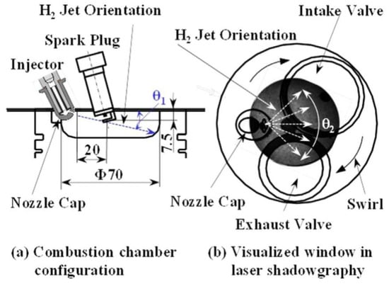 Setup of the combustion chamber design and organization of peripheral components. (a) Depicts a cross-sectional view of the combustion chamber, and (b) is provided to clarify the range of viewing [88].