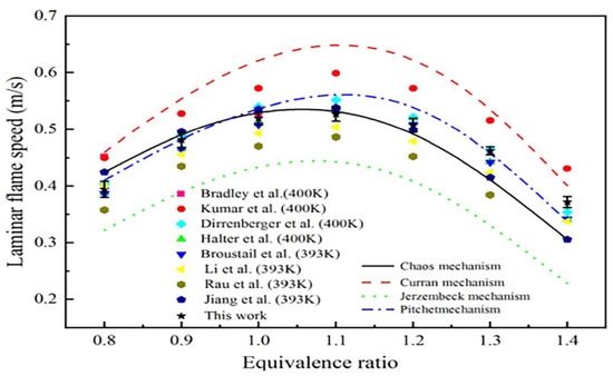 Han et al. [22] highlighted the uncertainty in the laminar burning velocity (LBV) measured by several organizations and the approach used was the outwards spreading spherical flame technique, which involves studying the combustion of hydrogen–air and syngas–air mixtures under normal temperature and pressure conditions, and identified the underlying reasons of uncertainty. As illustrated in Figure 3, it was discovered that the (LBV) measurements exhibit significant variability, making these empirical data untrustworthy for reducing the level of uncertainty in chemical models. The sources of uncertainty are examined in various flame propagation regimes, and 1-D simulations are used to evaluate each source’s contribution to the disparities. The findings indicate that ignition effects may be one of the primary causes of error for the laminar burning velocities of fuel-rich mixes, and that their contribution to uncertainty is highly dependent on the equivalency ratio. Moreover, the selection of the extrapolation model and the range of flame radius has a considerable impact on the accuracy of the laminar burning velocities that are observed. Nonlinear extrapolation is more robust to variations in the flame radius range than linear extrapolation. It is possible to lessen the effect of the chosen flame radius range on uncertainty when employing nonlinear extrapolation models, particularly for combinations that are fuel-rich or fuel-lean. However, strong nonlinear behavior between the stretched flame speed and the stretch rate still contributes to large discrepancies even when nonlinear extrapolation models are used. To address the nonlinear stretch behavior, a new nonlinear extrapolation model, NQH, is proposed and is shown to be more accurate than other models as pressure increases. Additionally, recommendations for the H2 and syngas LFS measurements using the OPF method are provided.