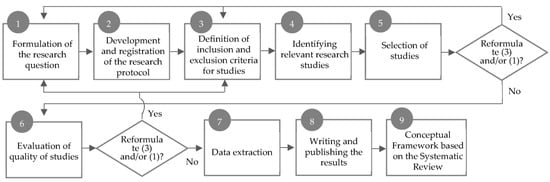 The methodological structure provided answers to the research questions related to the use of BIM in CDWM, which are detailed in Table 1. The systematic review was conducted following the latest Preferred Reporting Items for Systematic Reviews and Meta-Analyses (PRISMA) guidelines, reflecting the updates presented in the PRISMA 2020 Statement [42]. The PRISMA methodology is characterised by a structured flowchart that rigorously guides the steps of identification, selection, and inclusion of relevant documents. This process is complemented by the creation of an organised matrix with columns, enabling the efficient analysis of a large number of studies. The organisation proposed by PRISMA facilitates data extraction and comparison, that promotes greater clarity and consistency in the presentation of results. The methodological structure used for the development of this review was based on previous studies, such as [43,44], and involved the application of 9 steps, which are summarised in Figure 1.