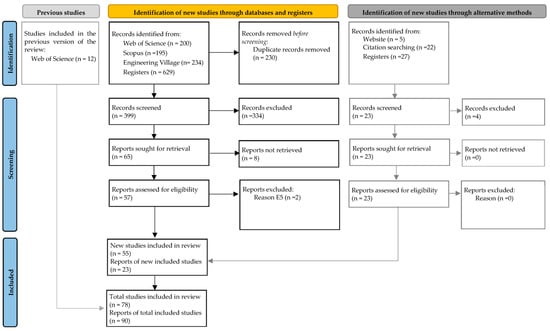 The results from the application of PRISMA, as discussed in Section 2.1 and Section 2.2, are presented in the article selection flow diagram shown in Figure 2. Initially, 641 studies were identified and retrieved from searches conducted in three databases (212—33% Web of Science (WoS); 195—30% Scopus; and 234—37% Engineering Village (EV)). Additionally, 27 articles were manually included, with 22 coming from studies referenced in other reviews and 5 from websites, including 2 obtained through the Academic BIM Portal—a BIM repository supported by the Brazilian government. From these analyses, 230 studies were removed due to duplication, resulting in 399 articles classified for the selection phase. During this phase, 334 studies were excluded based on the title, abstract, and pre-established inclusion and exclusion criteria, leaving 65 articles for eligibility assessment. After a full reading of these studies, 55 articles were selected from the databases, and an additional 23 manually selected studies were considered in this systematic review. Furthermore, 12 articles obtained from the WoS database, from a previous study conducted by the authors, were also included. Therefore, a total of 90 articles were included in this systematic review addressing the application of BIM tools and devices in CDWM.