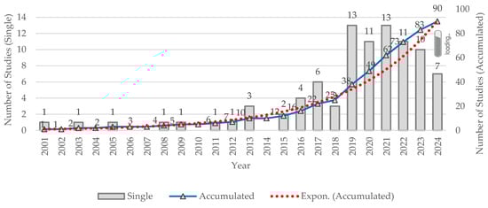 When examining the evolution of publications addressing the BIM methodology applied to CDWM between 1998 and 2024, the first publication on this topic appeared in 2001. Since then, there has been exponential annual growth, with a notable increase in studies over the past decade. By 2013, only 10 studies on this topic had been published, representing 11% of the relevant research included in this systematic review. On the other hand, 89% of the total studies were published between 2015 and 2024. This upward trend clearly highlights the growing relevance and academic interest in CDWM research using BIM for this purpose.