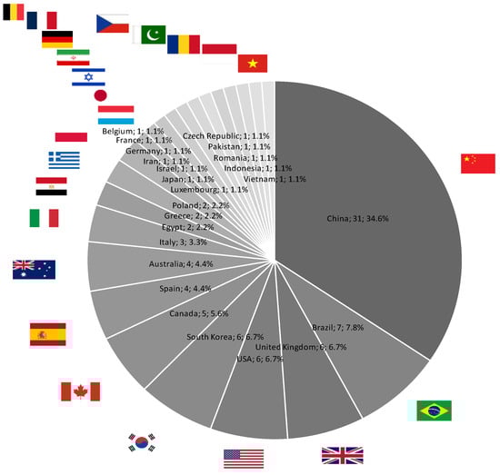Considering the affiliation of the first author, among the twenty-four identified countries, it was observed that China accounted for the largest number of publications, representing 34,6% of the total. Following China, Brazil contributed 7,8%, while countries such as the United Kingdom, the United States, and South Korea each accounted for 6,7%. Canada contributed 5,6% of the publications, while Spain and Australia each had 4,4%, and Italy contributed 3,3%. Other countries like Egypt, Greece, and Poland had a 2,2% share each. Similarly, Belgium, France, Germany, Iran, Israel, Japan, Luxembourg, the Czech Republic, Pakistan, Romania, Indonesia, and Vietnam each contributed 1,1%.