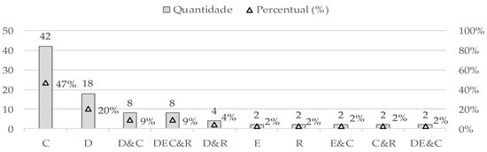 When analysing the life cycle phases of buildings in the context of BIM application for CDWM (Figure 5), it is observed that 69% of the studies focused on the construction phase, with 47% dedicated exclusively to this stage. Additionally, 8% (D&C) of these studies included demolition, and another 8% (DEC&R) adopted a holistic approach encompassing the entire life cycle. Only 6% (E&C/C&R/DE&C) addressed multiple stages, such as excavation, renovation, and demolition. Demolition was covered in 40% of the studies, with 18% focusing solely on this phase. Excavation was examined in 14% of the cases, with just 2% dedicated exclusively to this activity. Renovation activities were present in 16% of the studies, of which 2% focused exclusively on this phase. Regarding project engineering, 59% of the studies focused on design activities, while 53% also concentrated on planning, and only 9% addressed budgeting. This overview reveals a predominance of the construction phase in the analyses, but also indicates a growing trend towards considering the complete life cycle of buildings, directed towards an integrated and sustainable approach. However, the limited attention to budgeting highlights an area that still requires further development, particularly to ensure effective and economically viable CDWM.