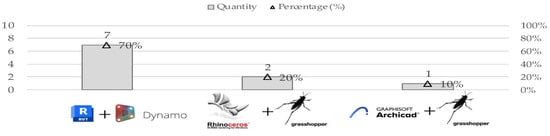In this context, 10 studies employed VPL-based software for the creation of tools aimed at CDWM (Figure 8), such as Dynamo applied to Autodesk Revit (70%) [64,76,77,97,134,135,136], Grasshopper with Rhinoceros 3D (20%) [107,137], and Grasshopper with Graphisoft Archicad (10%) [138]. Additionally, buildingSMART International [113] mentions some open-source software add-ons dedicated to visual programming, such as Sverchok (a Blender add-on) and DynFreeCAD (FreeCAD API). Another noteworthy tool is the Octopus plug-in for Grasshopper [138], which applies optimisation methods based on the selection and combination of the best solutions, facilitating multi-objective optimisation and the simultaneous exploration of alternatives in parametric design [139], as discussed in Section 3.11.