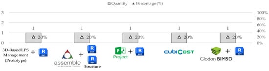 In this regard, only three studies implemented software aimed at 4D BIM [51,147,148] (Figure 9), exploring the integration of BIM to optimise processes related to planning, although with different focuses and approaches. These studies illustrate the effective use of 4D BIM in optimising planning and providing progressive construction visualisation, encompassing accurate quantification and minimisation of CDW.
