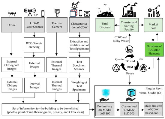 The architecture, engineering, construction, and operations (AECO) industry is a sector of significant economic importance on a global scale. However, it faces an urgent need to enhance its environmental performance to develop more sustainable projects and constructions [1]. This pursuit of sustainability is closely linked to the use of advanced technological tools [2] and strategies that promote the circularity of construction and demolition waste (CDW) [3]. A particularly important aspect of this objective is the reduction, reuse, and recycling of CDW. The significant amount of waste generated by the AECO industry places a heavy burden on the sustainable development of large cities [4]. Studies across various global regions indicate that the AECO industry contributes between 37% and 60% of the total municipal solid waste (MSW) generated [5,6]. However, the rate of reuse and recycling varies considerably, depending on the infrastructure, policies, culture, and technologies implemented [7].