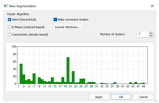 The indicator was displayed on a diagram, where the number of clusters was shown on the horizontal axis. The vertical axis allowed one to see the indicator values for each cluster system, which could be interpreted as follows: if the indicator value was high for a particular cluster system, the clustering process could be considered “natural” or “inherent” to the constructed map. Conversely, low indicator values suggested that the clustering was “artificial”. This indicated that the peaks on the cluster indicator graph represented true clustering. For economic reasons, it was decided to select 7 clusters for further analysis, as choosing 2 or 20 clusters would not be economically efficient.