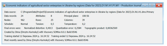 Key technical indicators of the method and the constructed map included a normalized distortion of 0.4013 and a quantization error of 0.2584. These values determined the degree to which data vectors from the initial dataset were well matched by the designated map node, thus indicating the quality of the map’s training. The presence of these errors was identified and is illustrated in Figure 5.