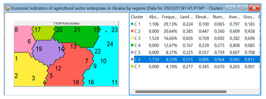 Figure 6 presents a map of the clustering of Ukrainian regions based on selected indicators of the agricultural sector. It consists of seven clusters, labeled from C1 to C7. The number of each region in Figure 6 corresponds to its serial number listed in Table 1.