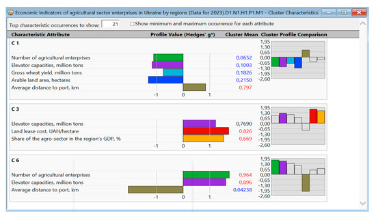 For instance, consider the diagram demonstrating C1, C3, and C6 (Figure 8), which illustrates the similarities among these areas. Subsequently, one can interpret the presented technical and graphical data. C1 was established based on several factors: the region’s significant distance from port maritime infrastructure, low elevator capacities, relatively small arable land areas compared to other regions of Ukraine, and a limited number of agricultural enterprises. C3 consisted of the regions that were grouped on the basis of high elevator capacity values and the highest land lease costs among all the studied regions in Ukraine. Additionally, the high proportion of the agricultural sector in the GDP of C3 regions was particularly notable.
