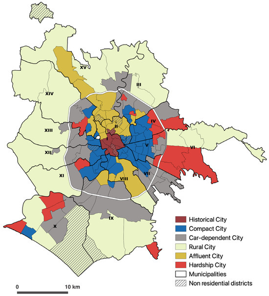 At the administrative level, Rome is organised into 15 Districts (Municipi). For statistical purposes, the municipal territory is subdivided into 155 urban areas (Zone Urbanistiche—ZUs) that are the reference for urban planning and management activities (some ZUs are scarcely inhabited and characterised by the presence of parks, services or archaeological sites; these are referred to as “non-residential”) (Appendix A). Figure 1 illustrates the above-described socio-spatial characteristics of Rome through a thematic classification of the ZUs in the six “cities”. We continue our analysis by defining and applying a proximity model for Rome at the ZU level and, further on, by discussing the results for the different urban contexts (cities).