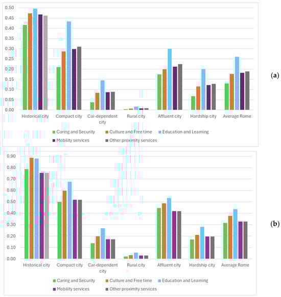 What changes from walking to cycling mainly depends on the territorial density of the services, as some are more spatially dispersed than others and therefore already offer better coverage when walking. For example, places of worship, kindergartens, and primary schools are better distributed, even in some peripheral areas. While differentiating between the “cities”, we can observe that the Car-dependent and the Rural Cities have very low proximity levels for almost all the services, as they are also the farthest from the centre. It is interesting to note that the Hardship City shows worse proximity levels if compared to the Affluent City, in this case also, at least in part, due to the greater distance from the centre (Table 4). Only the Historic and the Compact Cities have good proximity levels to USFs, which makes them easy to frame in terms of a 15 min city model; the remaining cities still have serious deficiencies in the services provision (Figure 4).