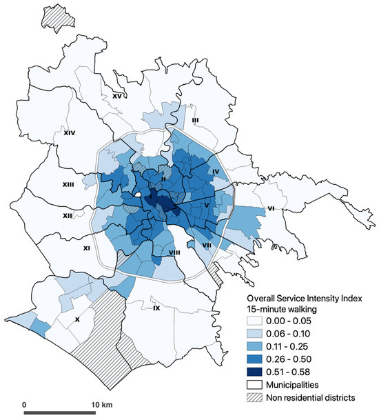 In our attempt to analyse the proximity to urban services in Rome from the perspective of the 15 min city, we assess the distribution of Urban Social Functions (USFs) at the sub-municipal level and, further on, we extend our analysis to the “seven cities” of Rome to obtain insights into the services distribution in relation to the socioeconomic characteristics of different urban contexts.