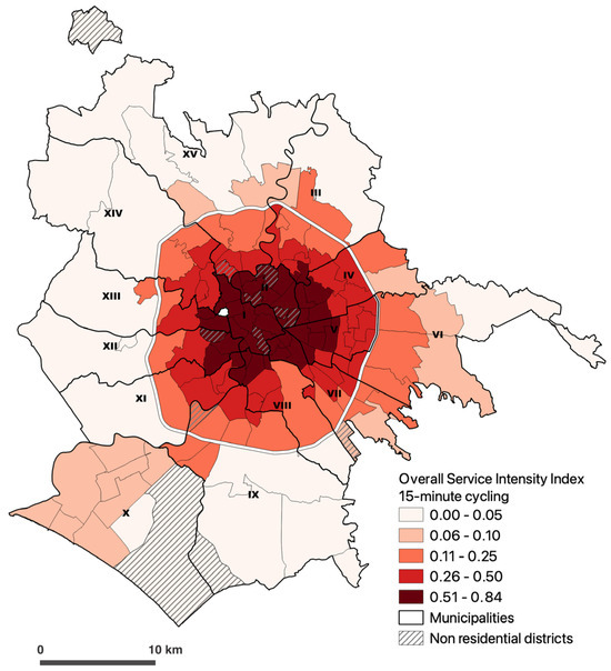 In addition, we decided to produce two “Overall Service Intensity Index” (OI) maps that consider all the services available within the 15 min walk and the 15 min cycle. The mapping outputs visually capture the overall proximity to services in the urban areas (ZU) and their spatial distribution.