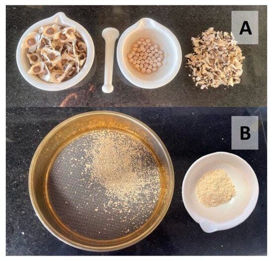 Process for obtaining M. oleifera seed powder (MOP): (A) shelling of the seeds and (B) powdered seeds obtained after the crushing and sieving process.