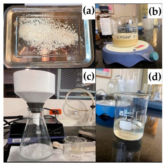 Process for obtaining extract of M. oleifera in distilled water (MODW). (a) Seed powder; (b) magnetic stirring of seeds in distilled water; (c) vacuum pump extraction; (d) 5% M. oleifera extract.