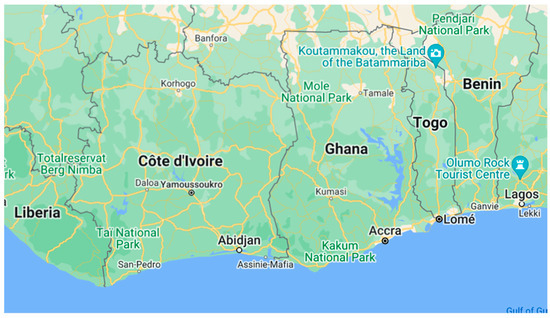 The village of Waraniéné is located 4 km southwest of Korhogo in the very north of Côte d’Ivoire. Driving from Abidjan, located at the coast, to Korhogo in the north, the tropical rain forest gradually changes into a savannah landscape (Figure 1). While being a part of Sub-Saharan Africa, the influence of northern Africa is clearly visible in the region, through the music, the culture, and the occasional sandstorm that colors the sky brown and makes the air unbreathable. The influence of the north is also visible through Jihadist attacks from Boko Haram operating from Mali [40]. While these attacks are now less frequent, European governments and international organizations strongly discourage approaching the Malian border (especially the Comoé National Park) because of the high risk of kidnapping.