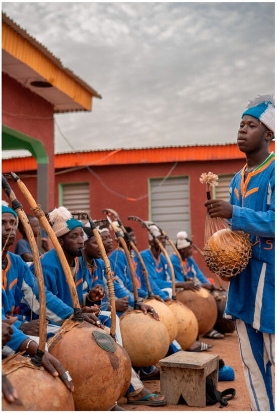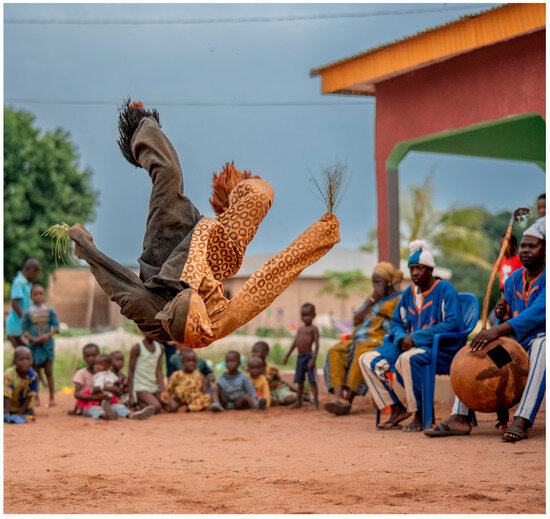 Moving beyond tourism studies, cultural performances have also been studied in relation to their ability to promote sustainability. A prominent publication along this line is the book Performing Sustainability in West Africa: Cultural Practices and Policies for Sustainable Development [37]. The chapters of the edited volume argue from various case studies that cultural performances contribute to social cohesion and peacebuilding; “social and economic development”; “national solidarity”; preservation and conservation; economic development, peace, and effective communication; “significant changes in the lives of the affected people”; “non-violence”; “inclusion of discriminated groups”; “positive change”; “social change”; trauma management; and “financial literacy”. As such, performances are recognized to have a role beyond entertainment and might serve important roles in society, while also potentially fostering exclusive tribalism and national chauvinism [38]. Aligned with this expansive view of the role of performance in society, Tetteh recognizes the “role of dance as a fundamental component of [African] society through which the evocation and invocation of cosmic entities translate into a spontaneous expression of a communal identity and shared experiences.” […] “dancer is not merely a performer, but rather the centre of the community’s life, embodying and expressing their collective emotions and beliefs” [39]. As such, Tetteh argues that dance performance in some African contexts is not only an art form but integrated into everyday life and experiences—which is a perspective that this paper subscribes to.