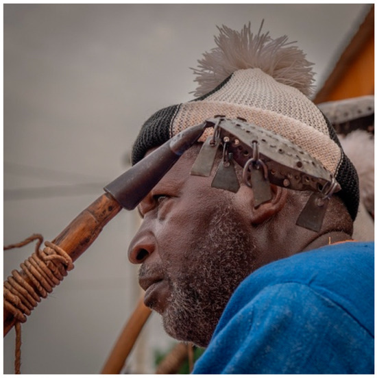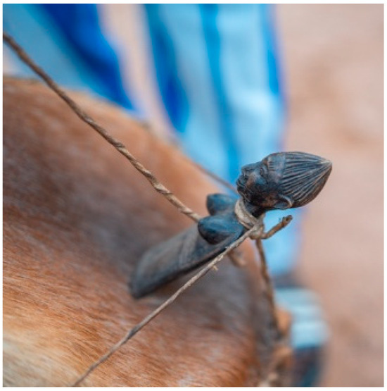 In the interview, the performers pointed out the cultural and ritual significance of the bolon instruments. The first phase of constructing the bolon is to make the handle (Figure 6). This handle is made by local blacksmiths using methods that pre-date the colonial era. As seen in Figure 6, the string is tied to the stick below the iron handle. The other end of the string is tied to a figurine attached to the goat skin covering the gourd (Figure 7). A local artist makes this figurine, and it depicts one of the spirits that initially performed the dance. The oldest bolon used at the performance is understood to be one of the original instruments obtained by the spirits. This bolon instrument is a fetish (i.e., a katching that requires regular sacrifices to offer protection). The kaching (sing.) is a yasunga, a ‘material object charged with energy that is worshipped’. In other words, the kaching can be described as a fetish in Western terminology [17]. After a performance at a funeral, they must sacrifice a chicken to the fetish. This is visible through the chicken feathers attached to the gourd.