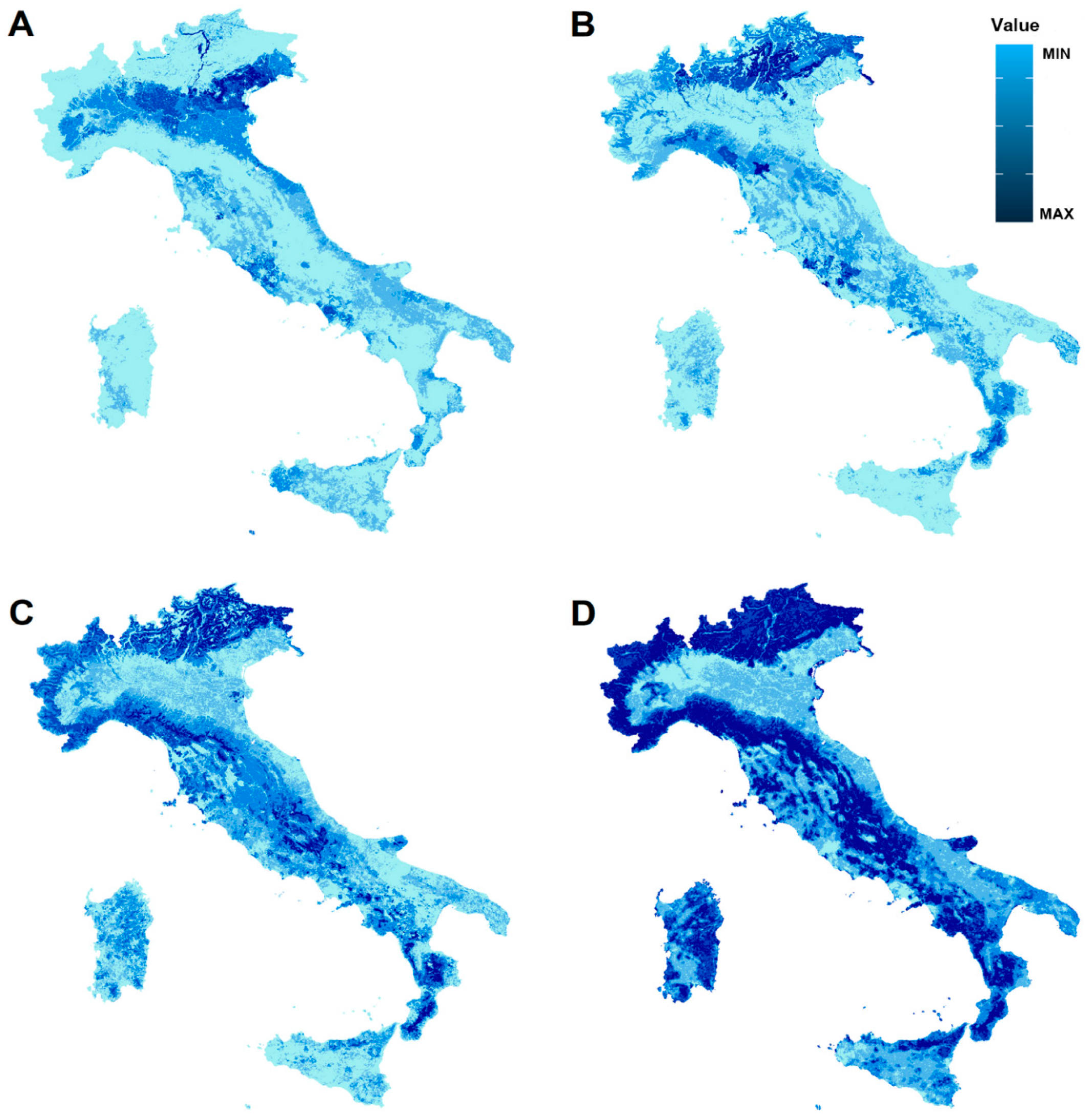 | Habitat quality | Supporting | €/ha | It refers to the ecosystem’s ability to provide suitable conditions for individual and population survival [49,57]. |