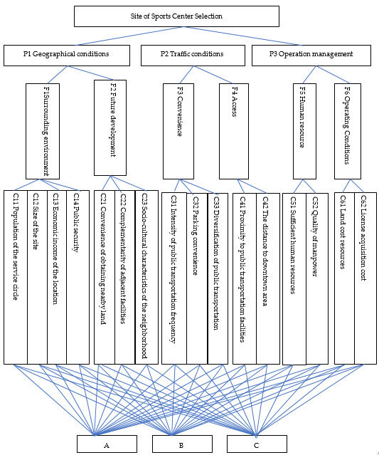A hierarchical structure is the framework of a system structure. The complete hierarchical structure for the site selection of the sports center contained the k criteria, sub-criteria and m alternatives.