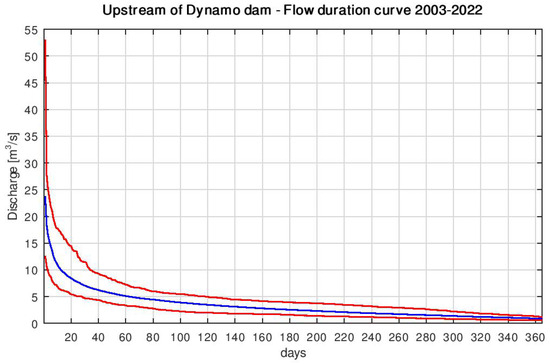 Flow duration curve for flows upstream of the Dynamo hydroelectric dam in the period 2003–2022. The blue line is the average curve, while the red lines are the minimum and maximum values.