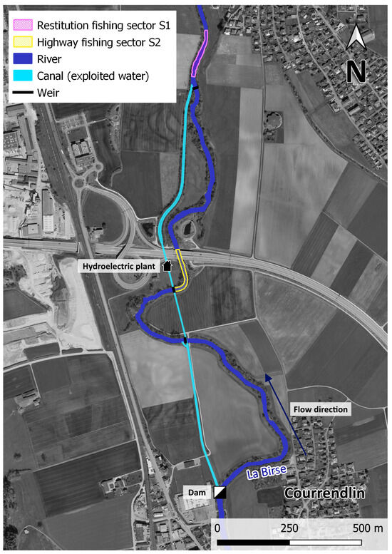 On 12 July 2023, the Jura Environmental Office (ENV) conducted an electrofishing survey in the study area to assess the impacts of the hydropower plant on the river reach. Two different sections were sampled, one downstream of the restitution junction, which is not affected by the water withdrawals necessary to operate the Dynamo (sector S1, length 154 m, pink area in Figure 3), and the other upstream of the restitution junction, which is directly affected by the Dynamo operation (sector S2, length 152 m, yellow area in Figure 3).