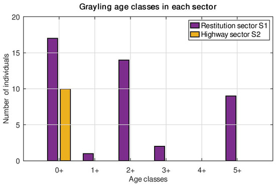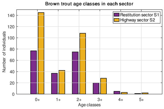 The number of individuals per age class for trout and grayling in each sector (Figure 4 and Figure 5) suggests that both species utilize the portion of the Birse not affected by hydropower operations throughout their entire lifespan. On the other hand, while trout of all age classes were present, in sector S2, only 0+ graylings were captured. This suggests that flow modifications caused by the hydropower plant affect grayling distribution.
